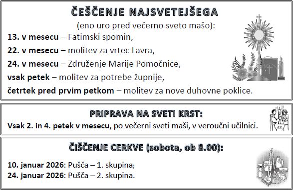 Darovanje za sončno elektrarno: Dragi verniki, na prvo nedeljo v mesecu januarju (5. januarja) bo nabirka za sončno elektrarno pri vseh svetih mašah. Svoj dar oddajte v kuverti na kateri naj bo napisan vaš naslov. Svoj dar lahko darujete tudi na TRR pri NLB: 02843-0263090952. V mesecu decembru ste v cerkvi in župnijski pisarni za orgle in elektrarno darovali 6.890,00 EUR. Bog plačaj za vse vaše darove!