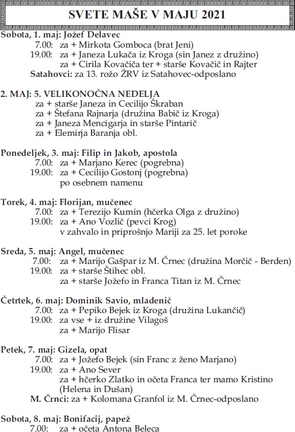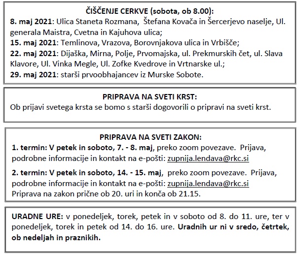 SVETA BIRMA: V naši župniji bo sveta birma v soboto, 3. julija, ob 9.00 uri. Srečanje za starše birmancev bo v petek, 21. maja, ob 19.45 v stolnici. Zaradi omejitev prosimo, da na srečanje pride samo eden od staršev! K pripravi na birmo in prvo sveto obhajilo spada tudi redno versko življenje (spoved, obhajilo ali sveta maša) in ne samo čakanje na datum slovesnosti! Udeležba birmancev in drugih veroučencev tako pri sveti spovedi, kot pri obhajilu ali sveti maši bi lahko bila dosti boljša. Možnost okužbe ne sme biti izgovor, ker potem, iz strahu pred okužbo, ne moremo imeti birme ali prvega svetega obhajila.
