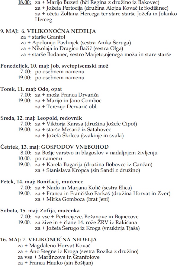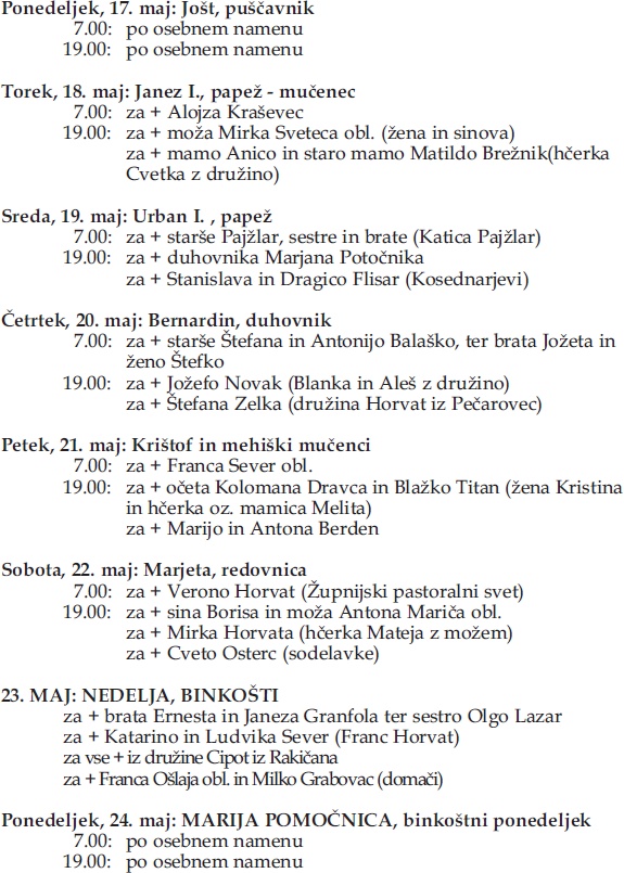 Svete maše se obhajajo z ljudstvom. Za maše ob nedeljah se več ni potrebno prijaviti. Maše bodo ob običajnih urah: 7.00, 8.30, 10.00 in zvečer ob 19.00 uri.