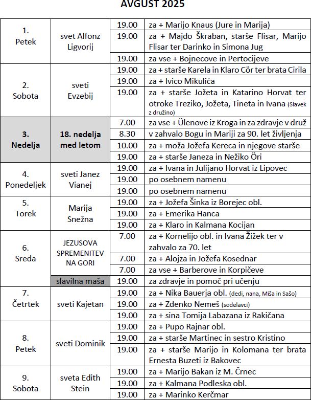 Slavilna sveta maša bo v sredo, 6. avgusta, ob 19.00 uri. Po sveti maši bo slavljenje in molitev za zdravje duše in telesa. Lepo vabljeni.