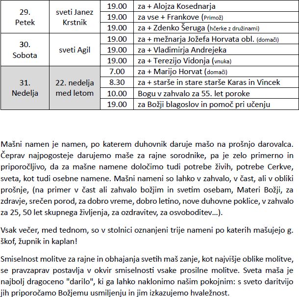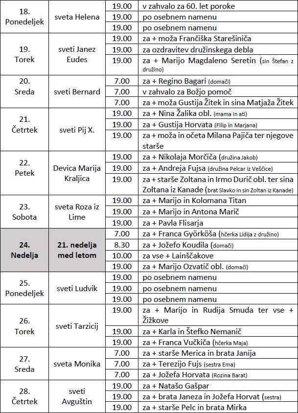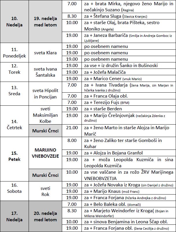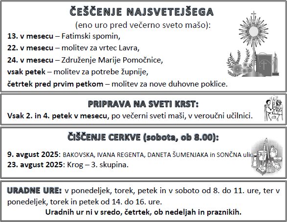 Na prvi petek, 1. avgusta, vabljeni k sveti spovedi, molitvi pred Najsvetejšim in k sveti maši. V petek dopoldne bomo obiskali bolne in ostarele po domovih, prijavite jih v župnijski pisarni.